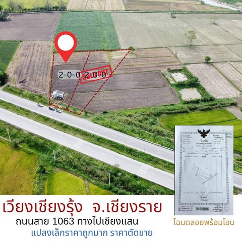 ขายที่ดินเปล่า 2ไร่ 1.9ลบ. ติดถนน4เลน ไปท่าเรือเชียงแสน ต.ดงมหาวัน อ.เวียงเชียงรุ้ง เชียงราย