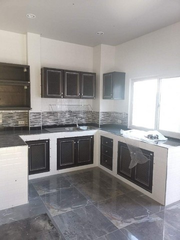 มีแอร์ 8เครื่อง ,โคมไฟตกแต่ง 2 ดวง บริเวณห้องรับแขกชั้น 1 - ห้องครัว ตกแต่งสำเร็จ พร้อมบานซิงค์ ตู้แขวน เตาแก๊ส อ่างซิงค์